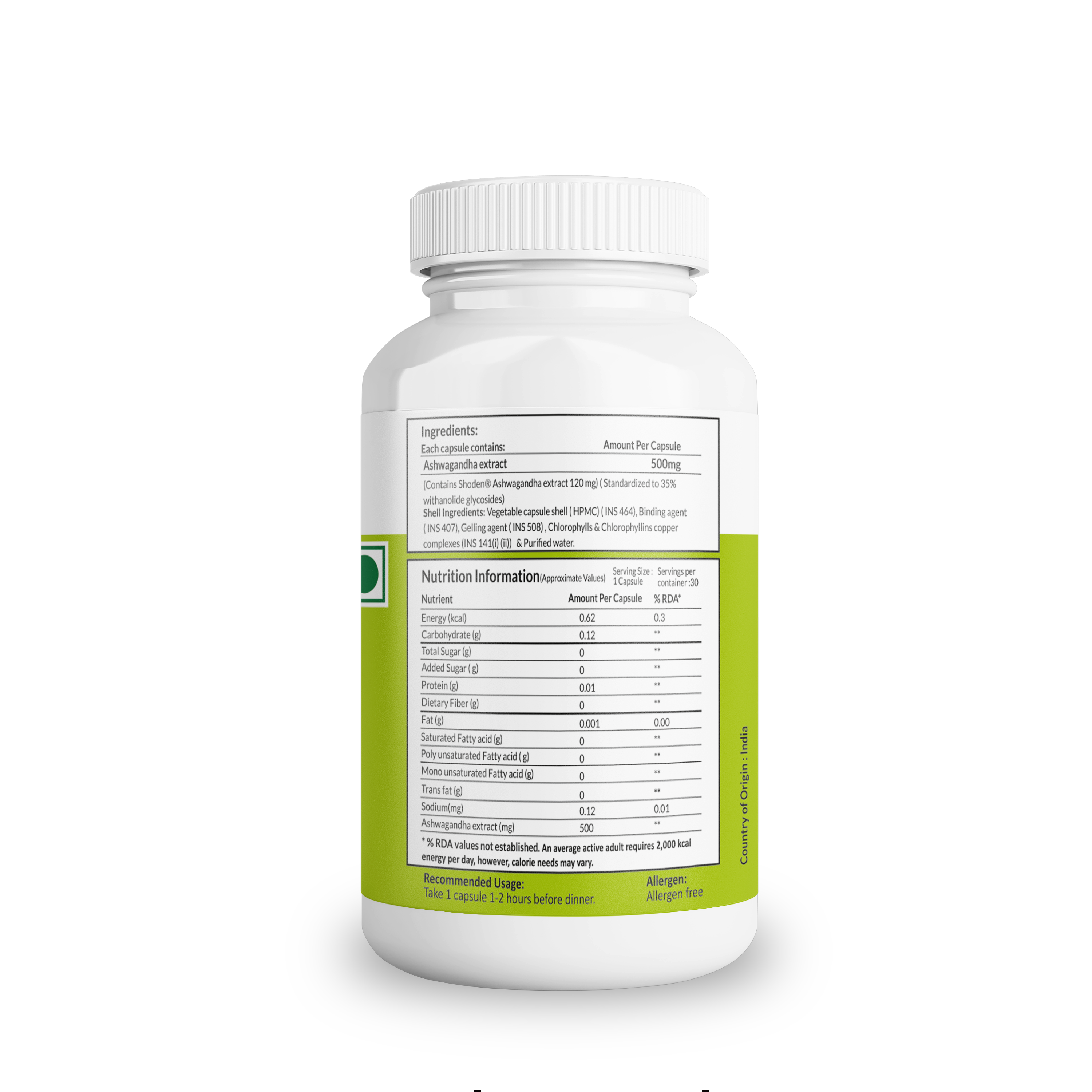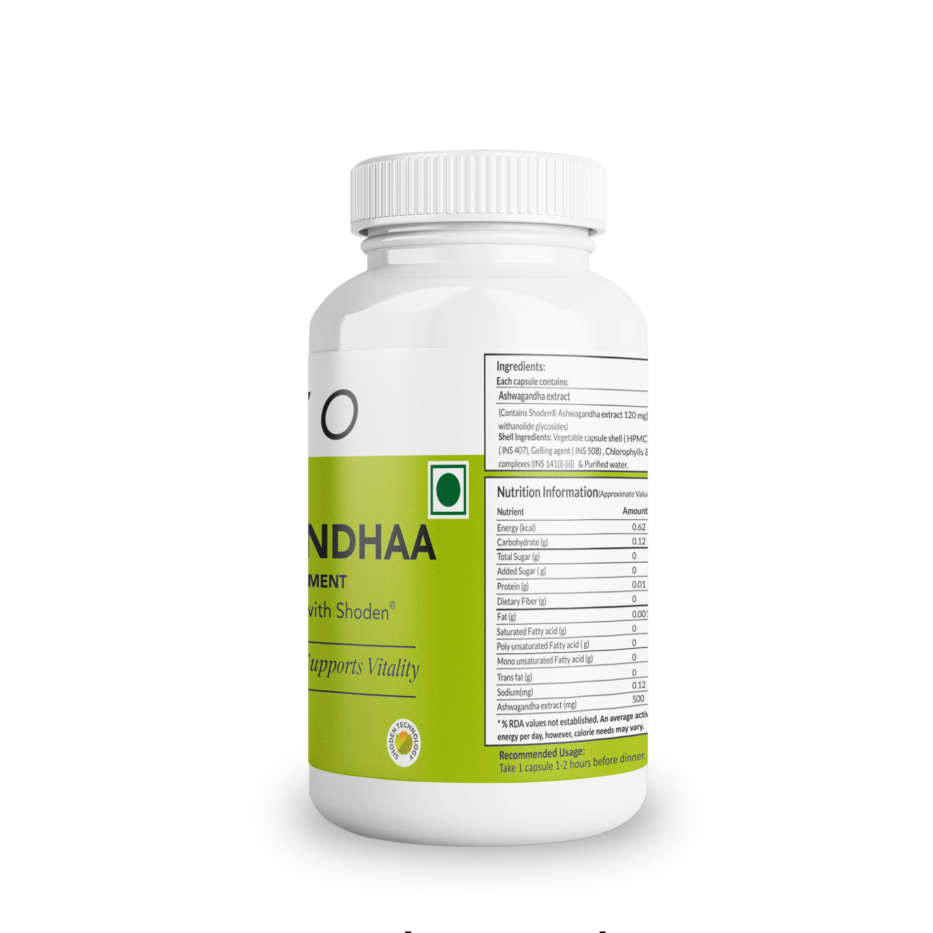 Ashwagandha extracts 500 mg per capsule, containing Shoden® Ashwagandha extract 120 mg standardized to 35% withanolide glycosides. Formulated using Bio-active Ingredient Protection System (BIPS). Vegetarian capsule. Manufactured in ISO, GMP, and FSSAI-certified facilities.