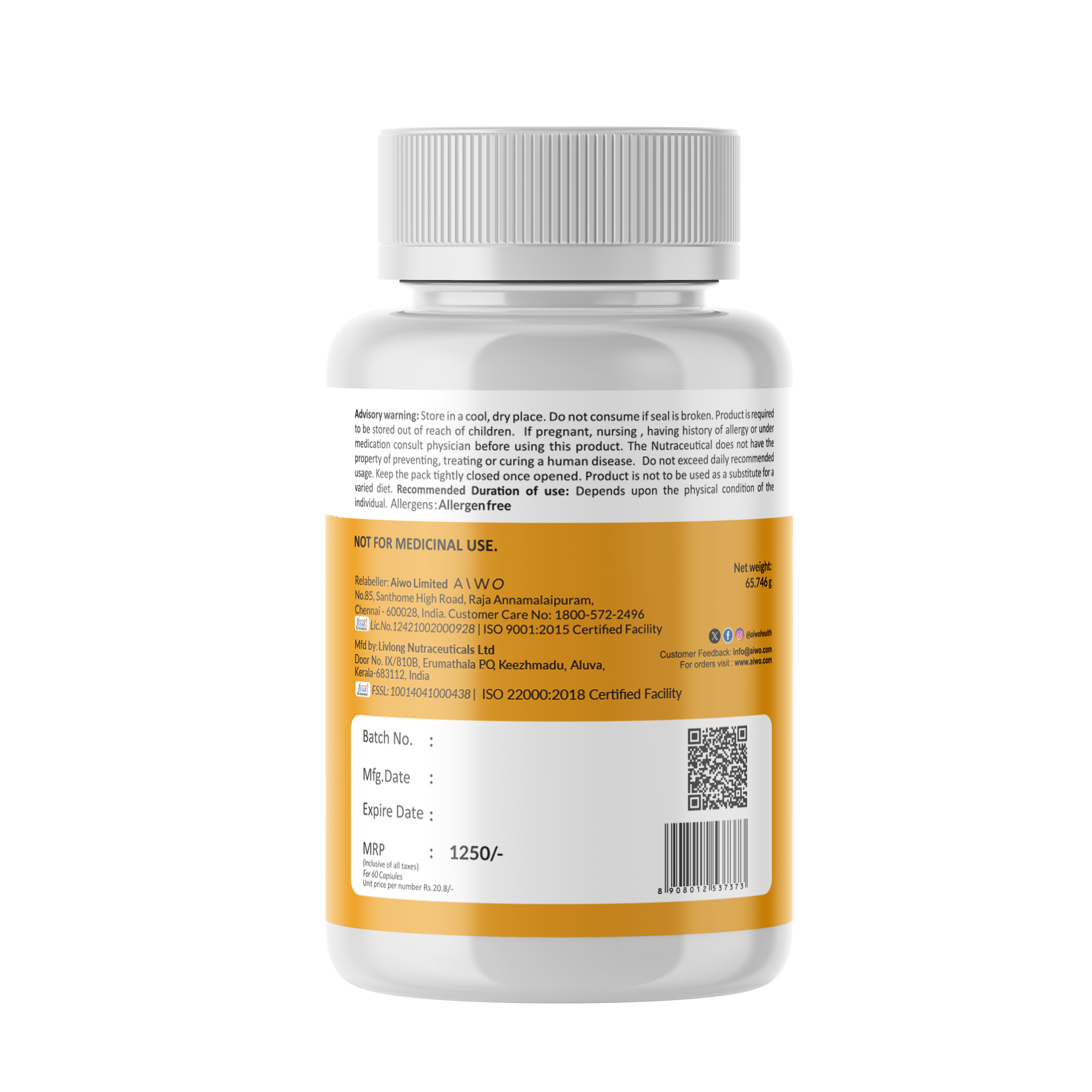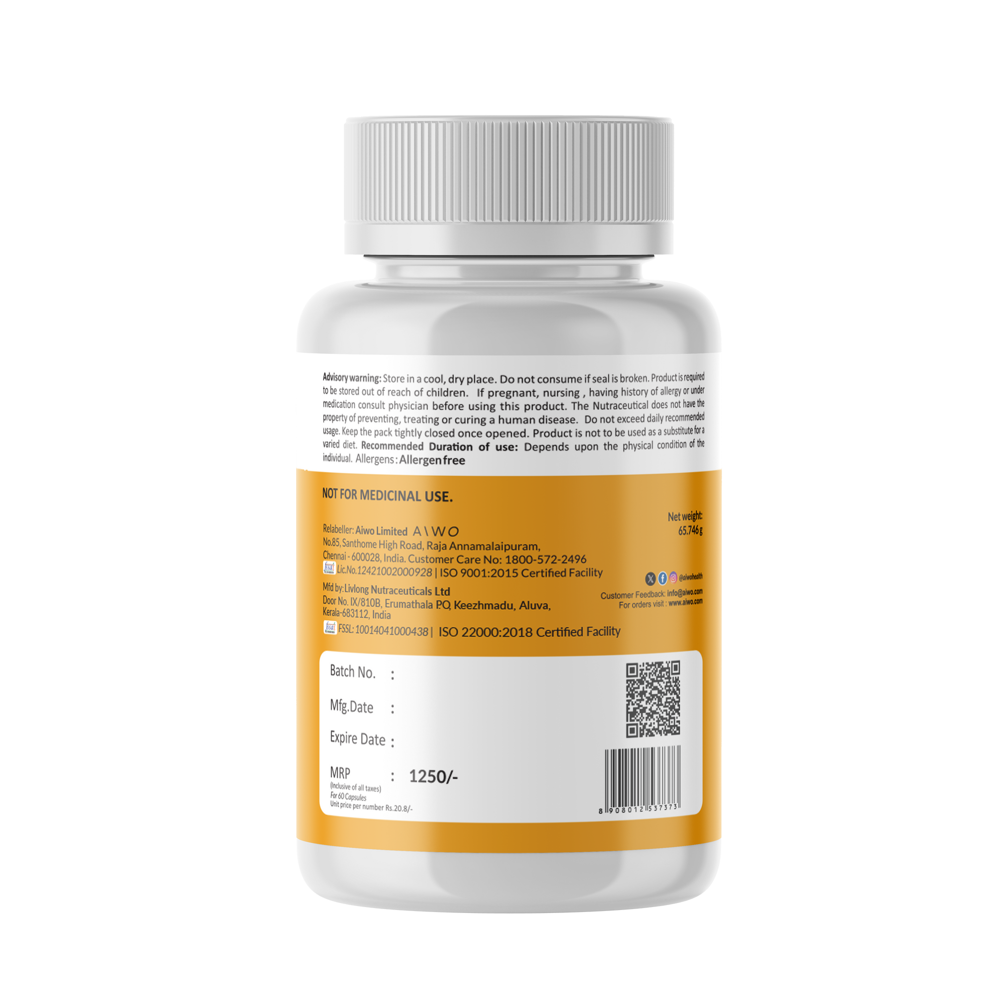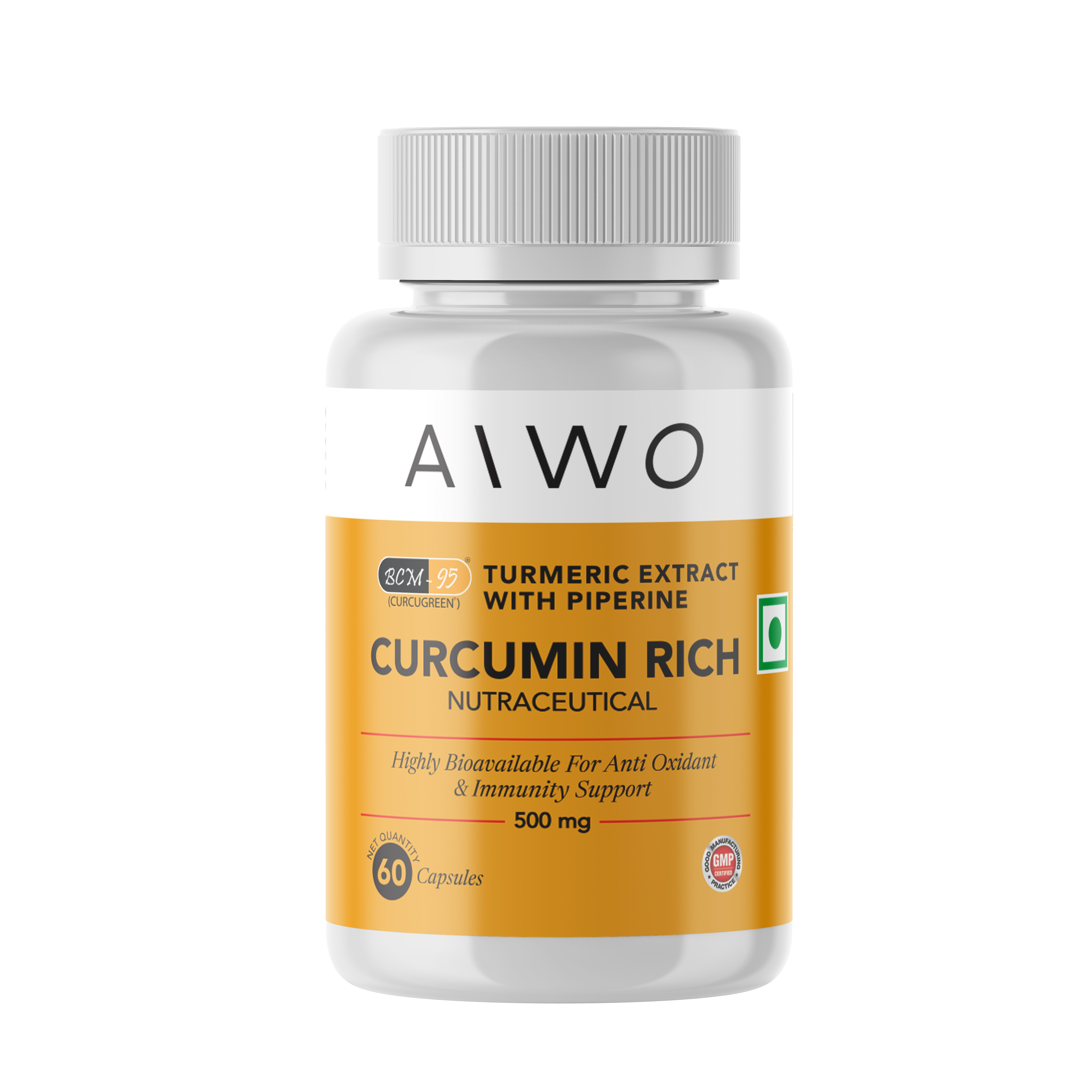 AIWO Curcumin Rich 500 mg is formulated with patented BCM-95® curcumin and piperine to deliver superior absorption, antioxidant protection, and anti-inflammatory support for joints, immunity, and overall wellness.