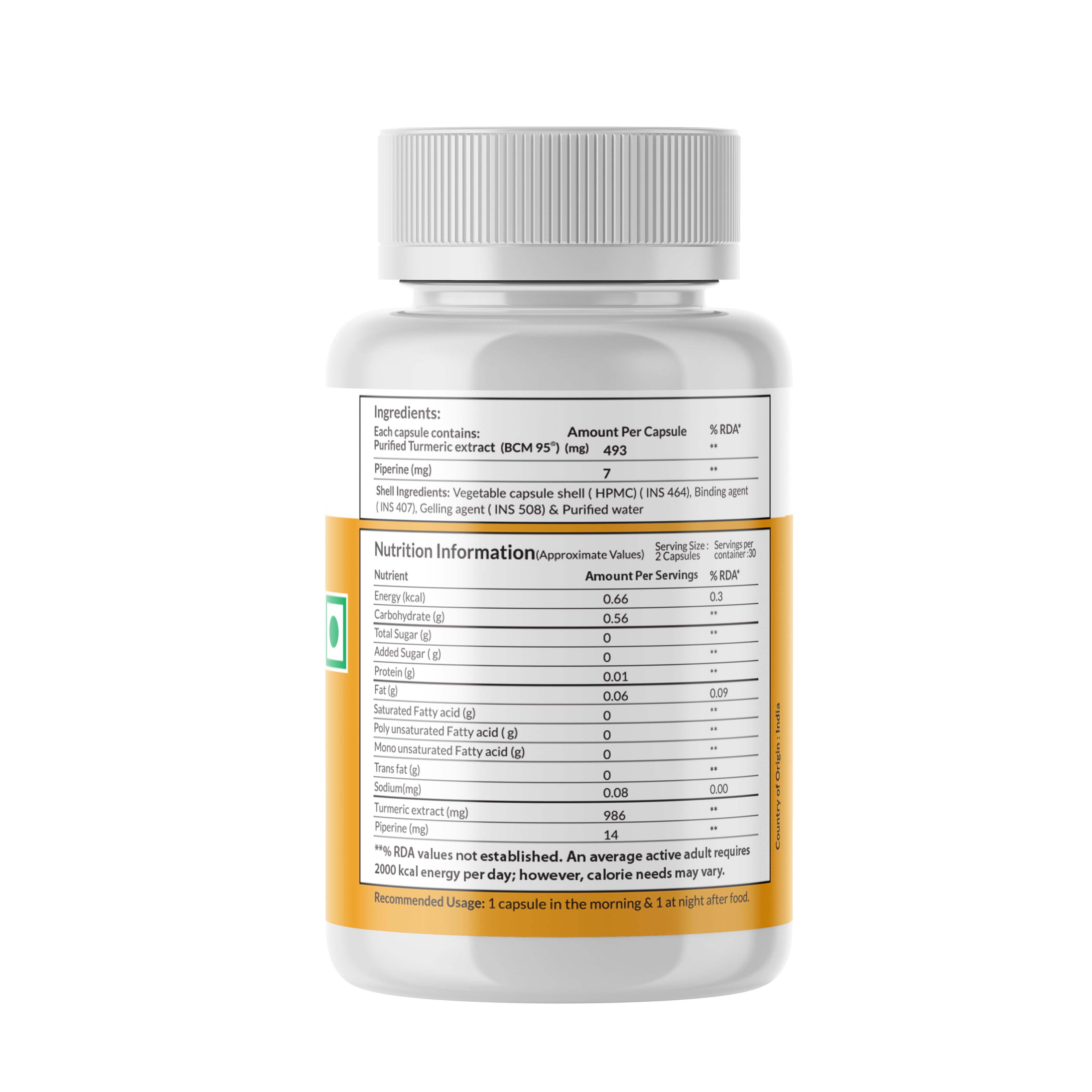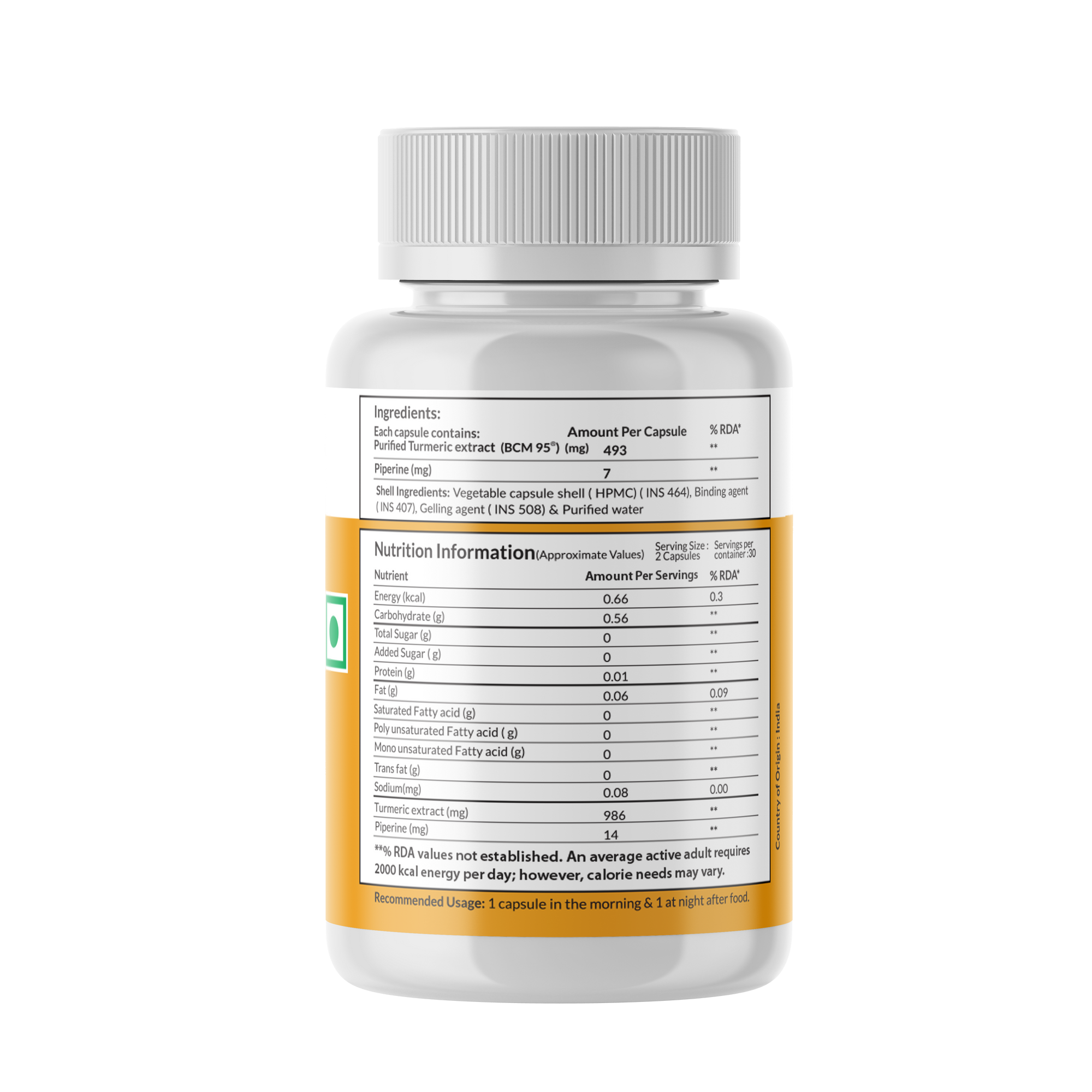 Purified Turmeric Extract (BCM-95®) 493 mg, Piperine 7 mg, vegetarian capsule shell (HPMC), binding and gelling agents, purified water.