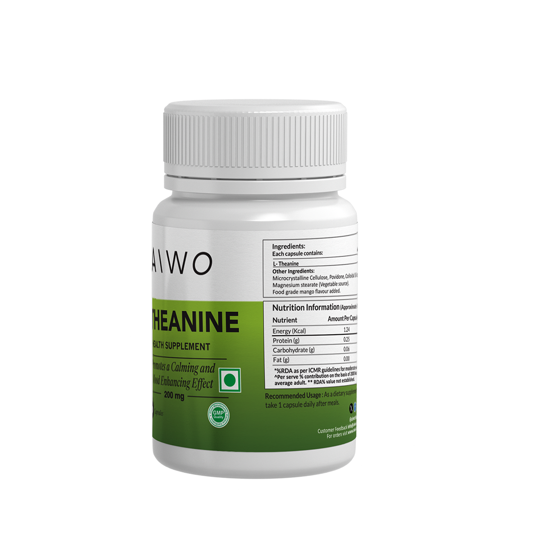L-Theanine 200 mg per capsule, naturally sourced from green tea. Formulated to support relaxation, focus, sleep quality, and stress management. Manufactured in ISO, GMP, and FSSAI-certified facilities to ensure purity and quality.