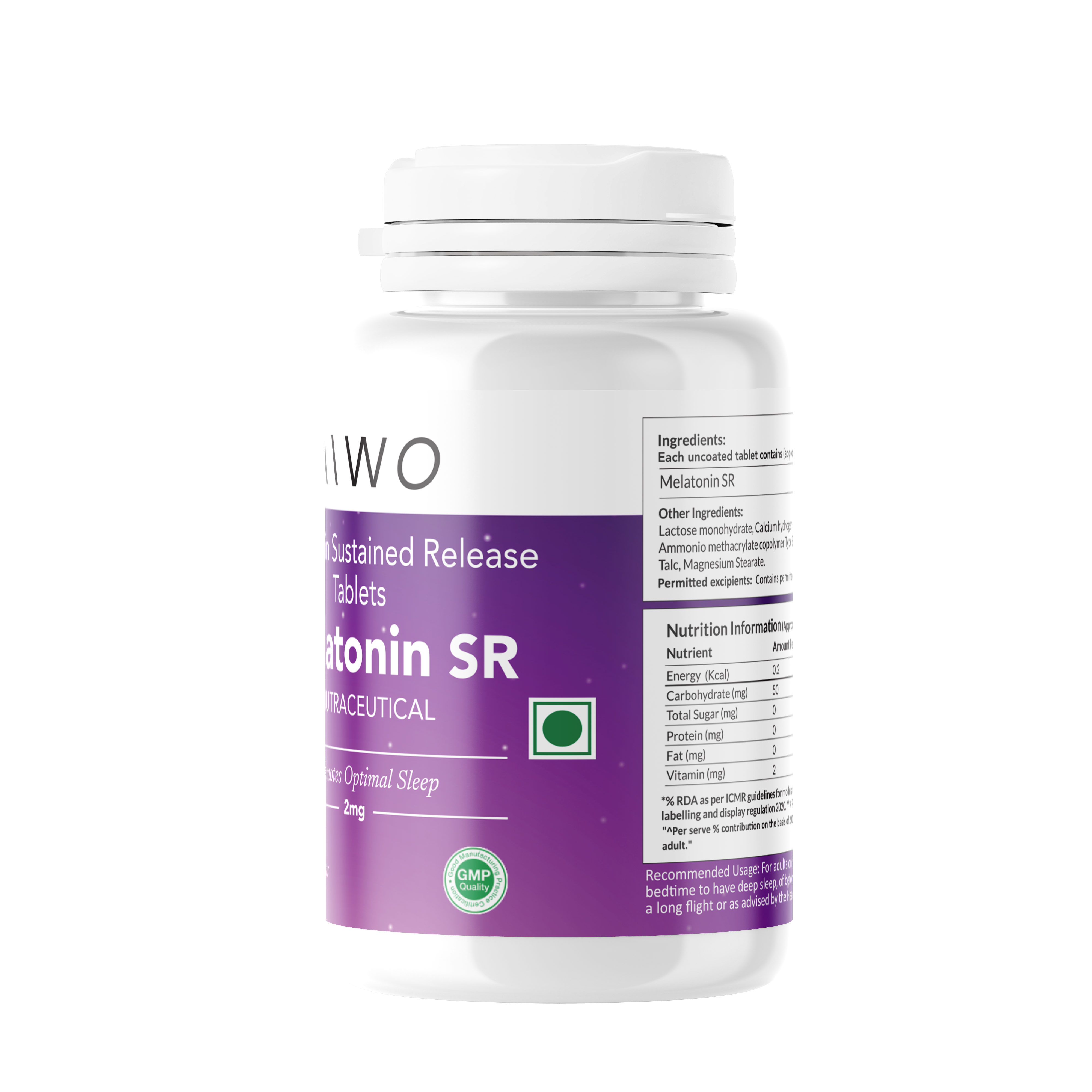 Aiwo MELATONIN SR 2 mg is a sustained-release formulation designed to support healthy sleep and circadian rhythm regulation. Melatonin is a naturally occurring hormone that helps regulate the body’s 24-hour sleep-wake cycle. The sustained-release technology ensures controlled delivery throughout the night, promoting restful sleep, antioxidant protection, and overall wellbeing.