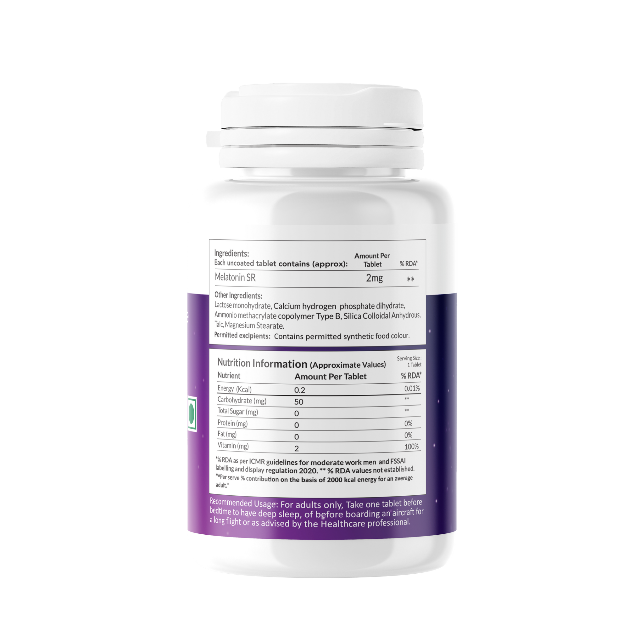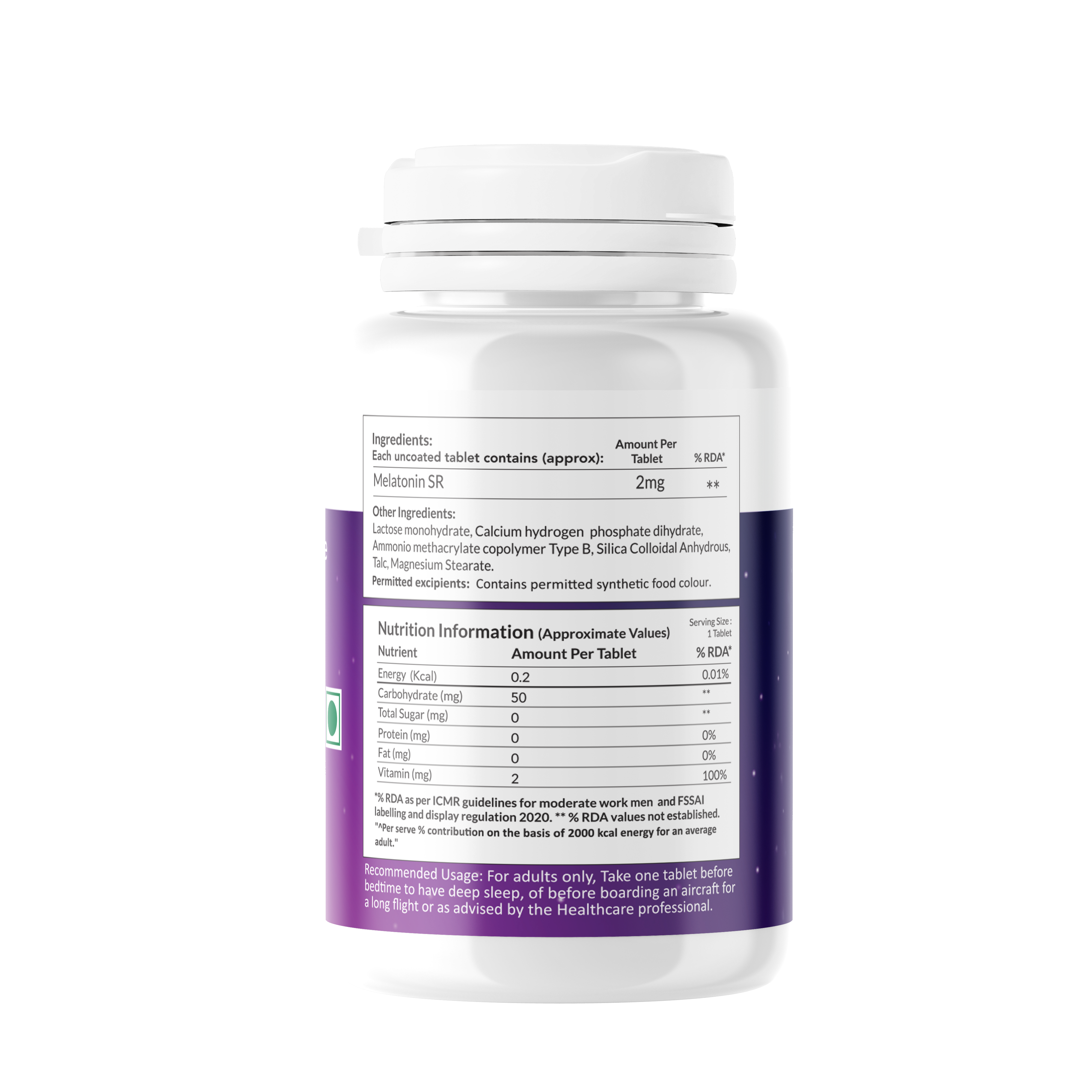 Melatonin 2 mg (sustained-release) per capsule. Vegetarian, drug-free formulation. Manufactured in ISO, GMP, HACCP, and FSSAI-certified facilities. Gluten-free and suitable for regular use.