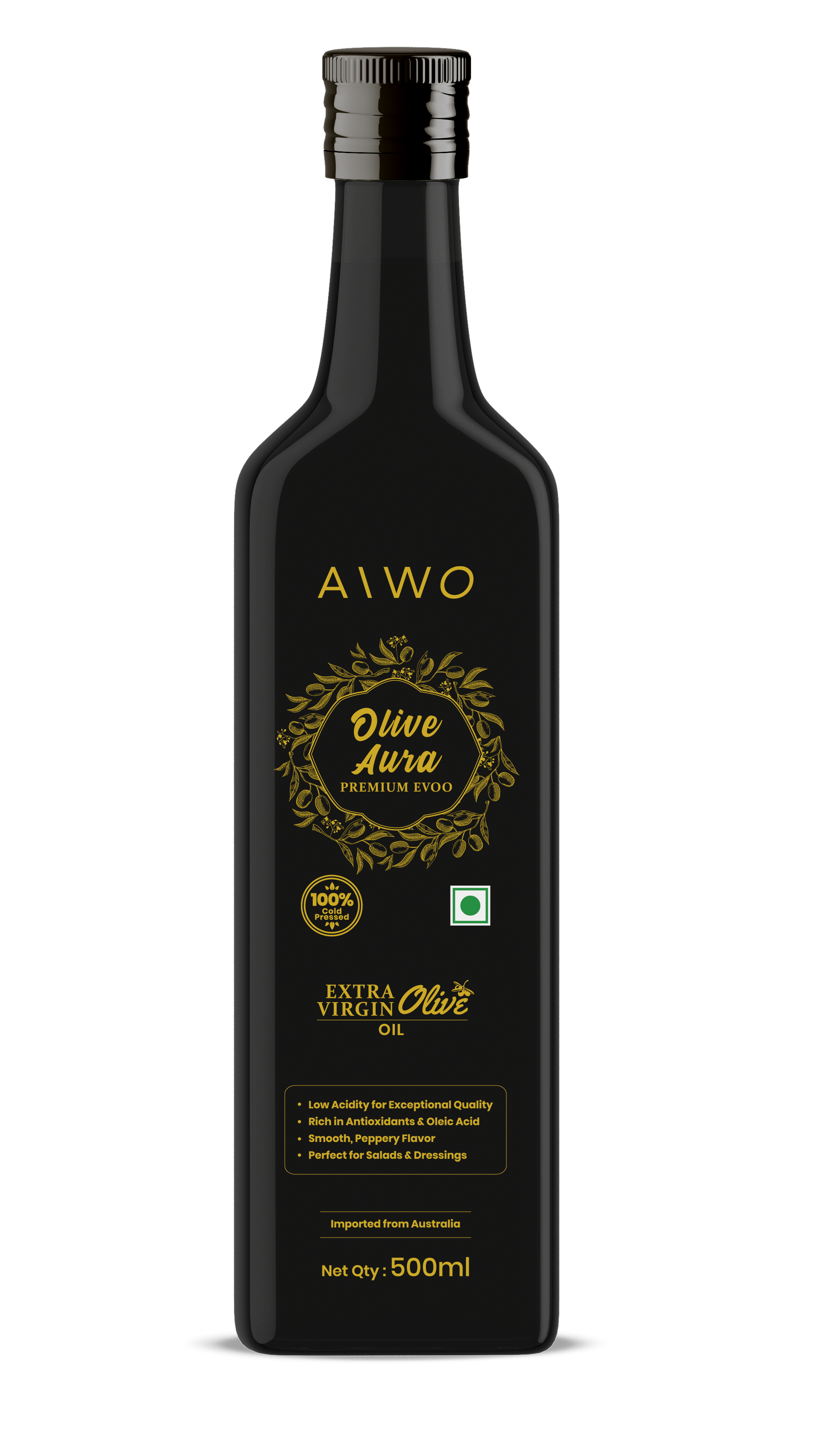 AIWO Olive Aura Premium EVOO is cold-pressed from Australian olives within 3 hours, low acidity, rich in polyphenols and MUFA, delivering fresh flavor and heart health.